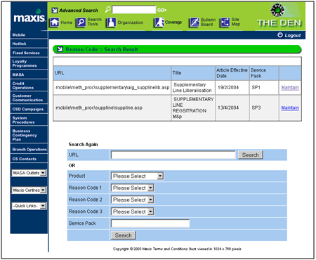 A web based intranet application to allow Maxis users to tag the content with the reason code meta-data. The meta data comes from the Clarify CRM system, and the enhancement is very beneficial to ensure fast and accurate search of content.